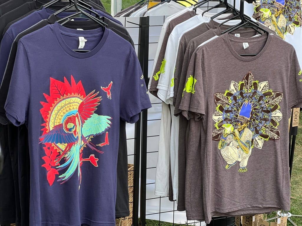 โEl Guacamayo Maluโ is available on 100% Organic Cotton, and โKambo Maestroโ is available on recycled tri-blend. Both are screenprinted by domestic print shops on garments made with fair labor, utilizing renewable energy.