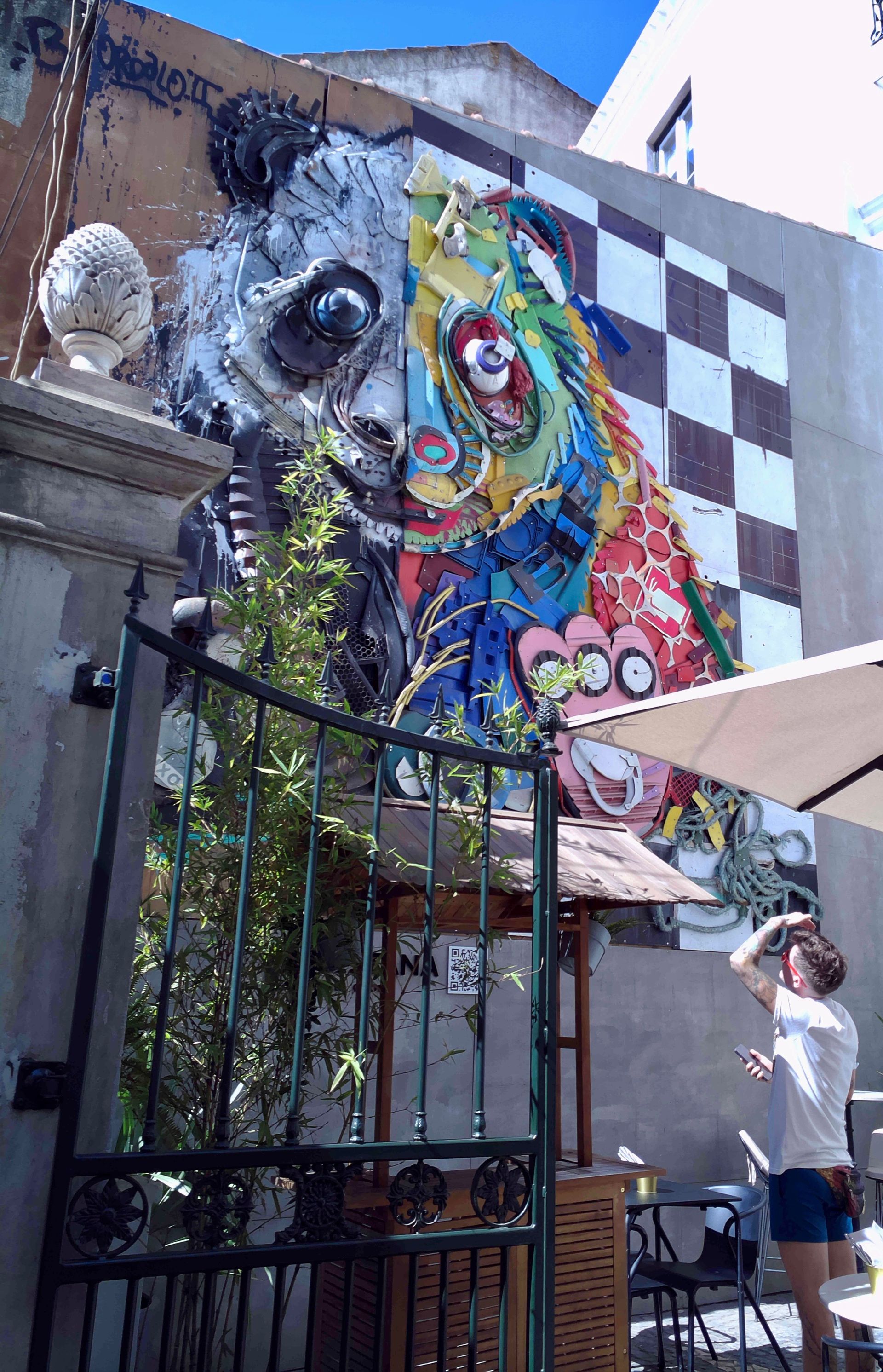In Lisbonβs winding neighborhoods, we encountered the striking work of Bordalo II, whose towering 3D murals turn discarded trash into expressive animal portraitsβa fox, storks, a pandaβreminding us that even waste can tell a story of beauty and reclamation.
