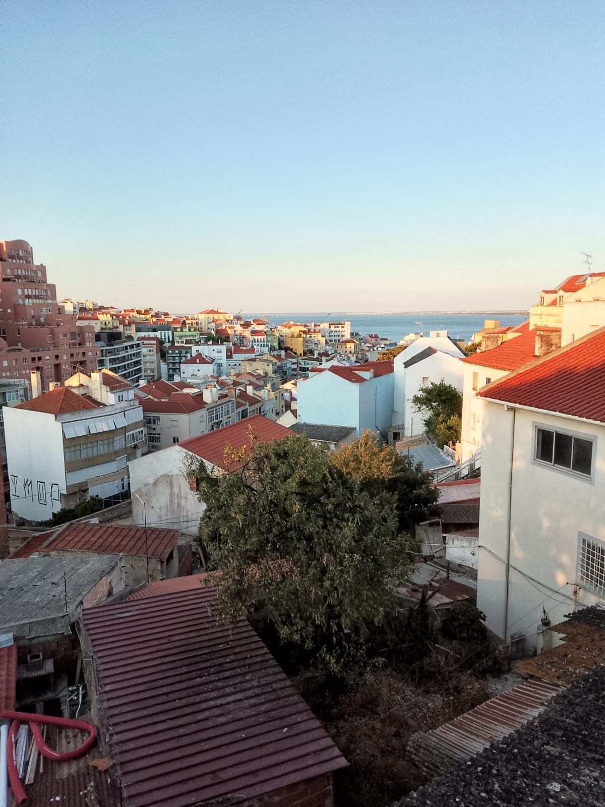 View from our apartment in the GraΓ§a neighborhood, with views of Rio Tejo. This neighborhood is relatively quiet and comes to life twice a week for a large neighborhood flea market.