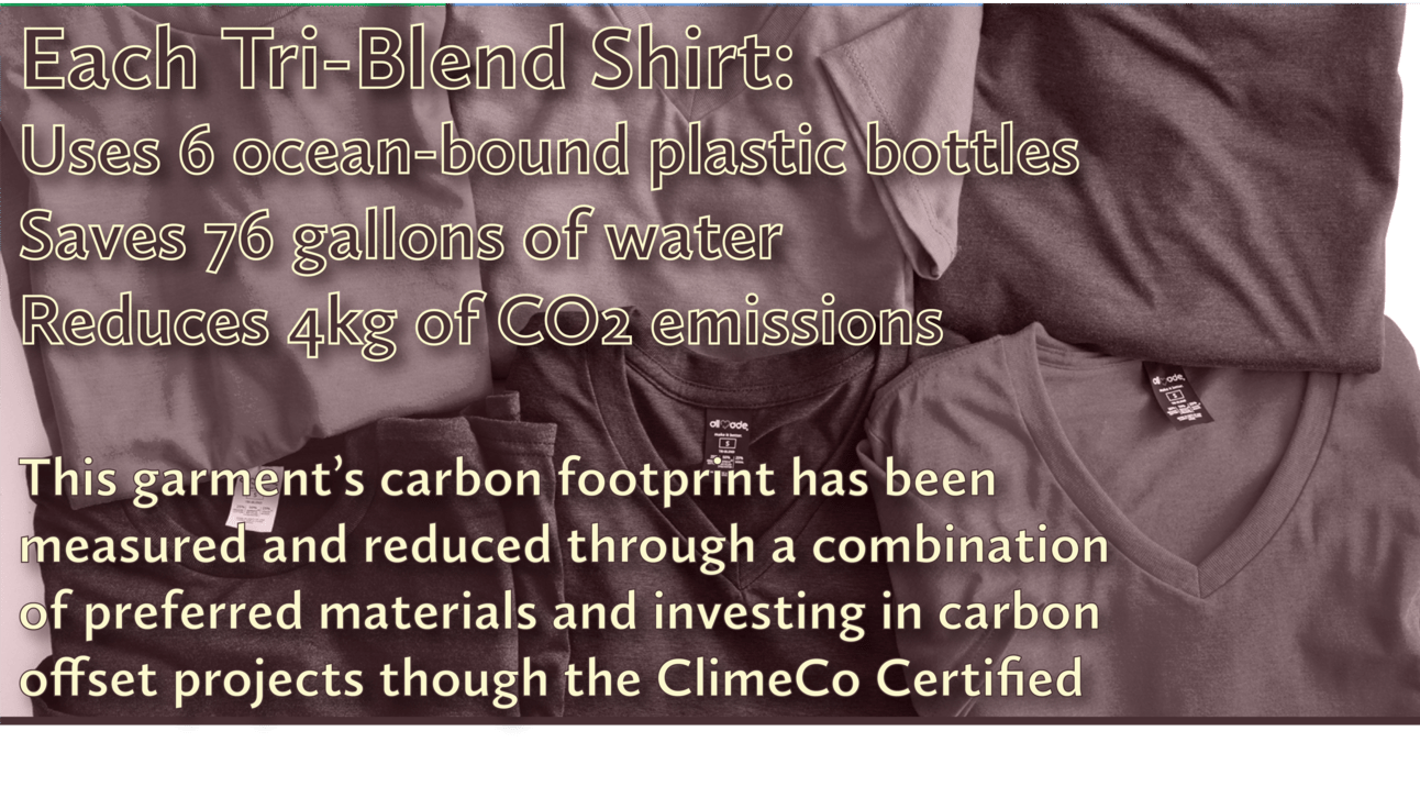 Some of our garments are printed on tri-blend t-shirts we spent time vetting. Tri-blend offers comfort, a nice drape, and softness - and ours are made utilizing clean energy, reclaimed, and organic materials.