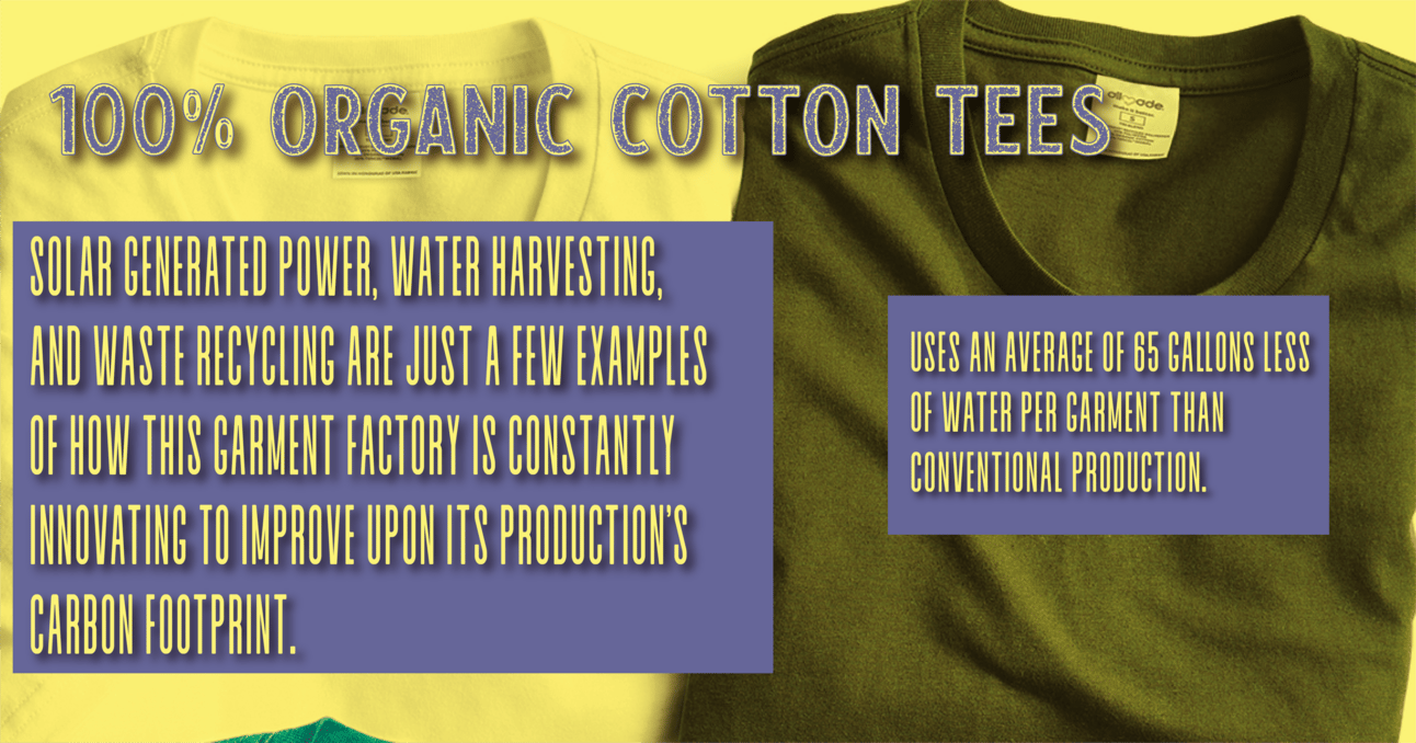 We offer a selection of unisex 100% organic cotton tees. Organic Cotton uses up to 91% less water to grow while rebuilding soil. Plus, these shirts use an average of 65 fewer gallons of water to produce, compared to conventional garments.