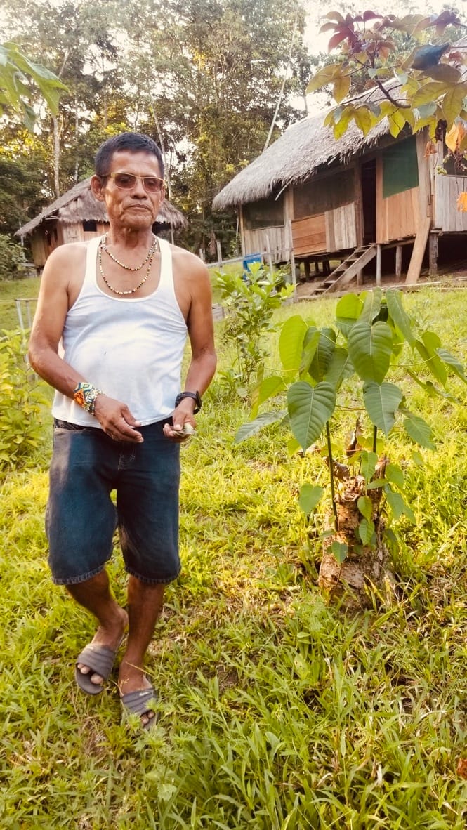 The late Maestro Jhonny Javá, standing before a young Brugmansia (Toé) plant, teaching us about its medicine. You can see this one is regrowing from a larger trunk that had previously been cut.