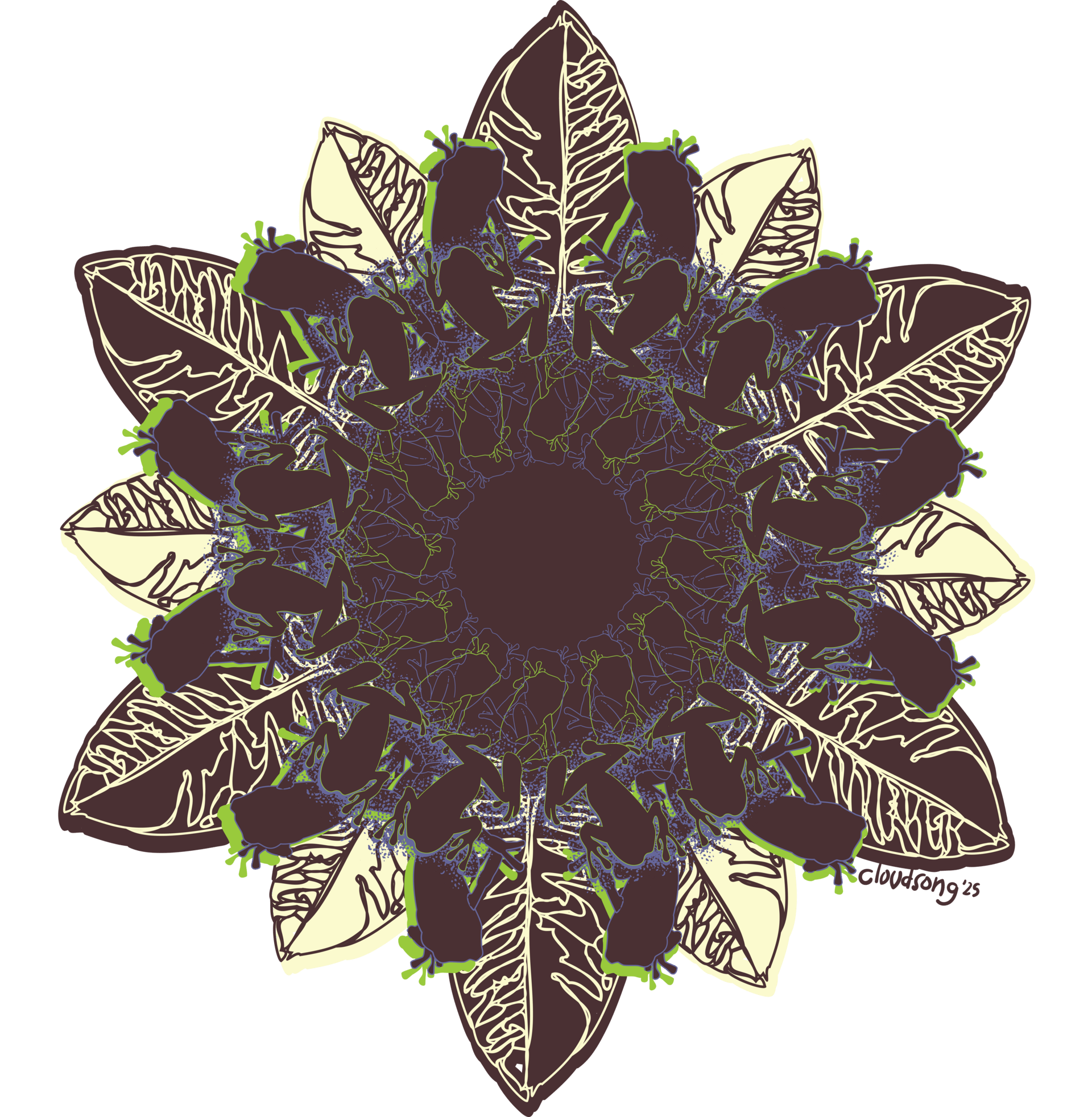 Balance of elements and numerology: The frog in the center with Toé leaves radiating outward—symbolizing an interplay of medicine, protection, and transformation. Interplay of 6 and 12 to represent matters of the heart and of harmony.