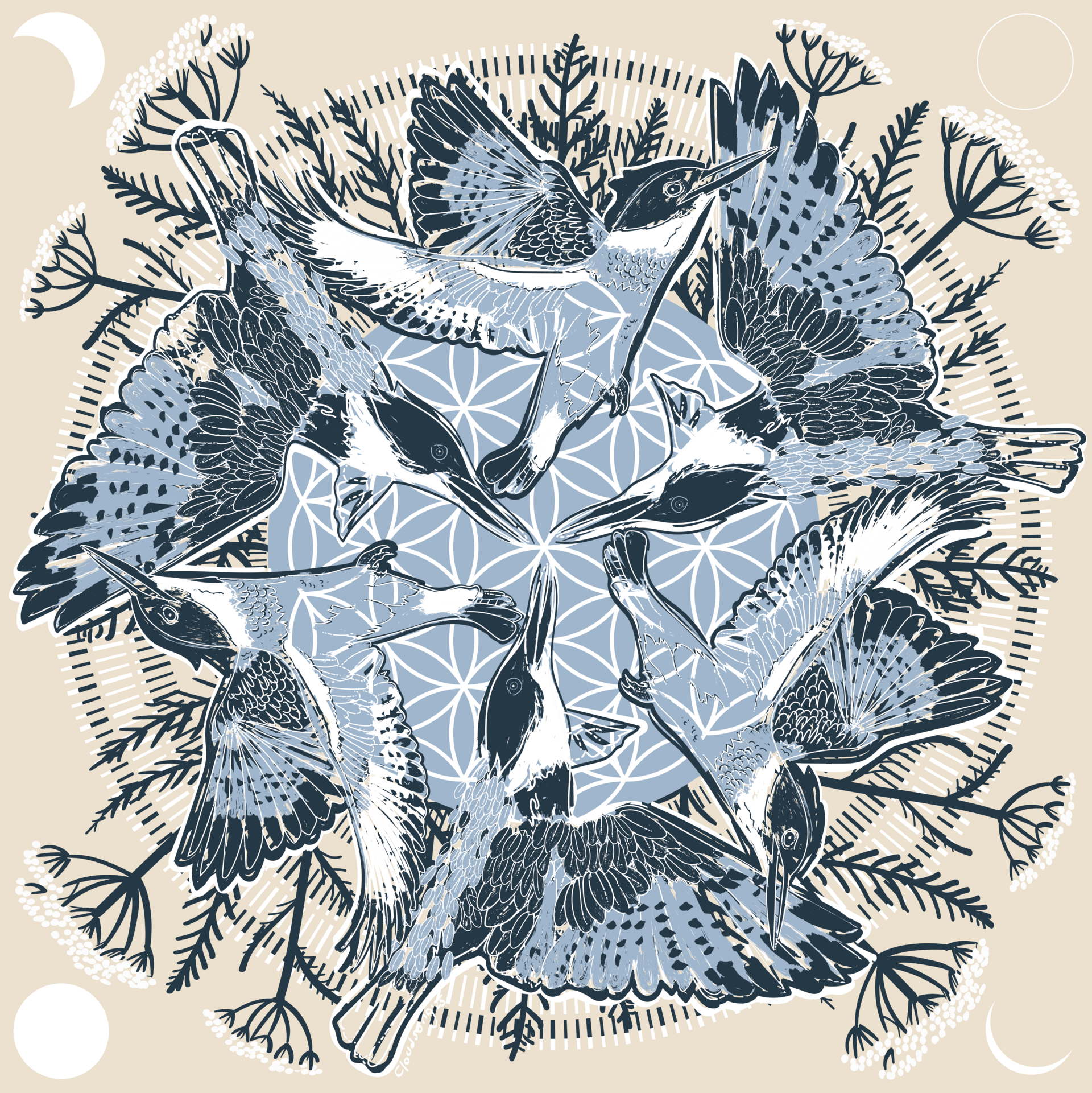 🩵 The Kingfisher, bold and sharp-eyed, dives with precision and confidence — reminding us to trust our vision even when the waters are unclear. Seen here with 4 stages of the moon, and the ancient plant medicine Achillea millefolium a.k.a., Yarrow. As with all my designs, numerology plays a role here, with 3’s, 6’s, and 4’s to consider.